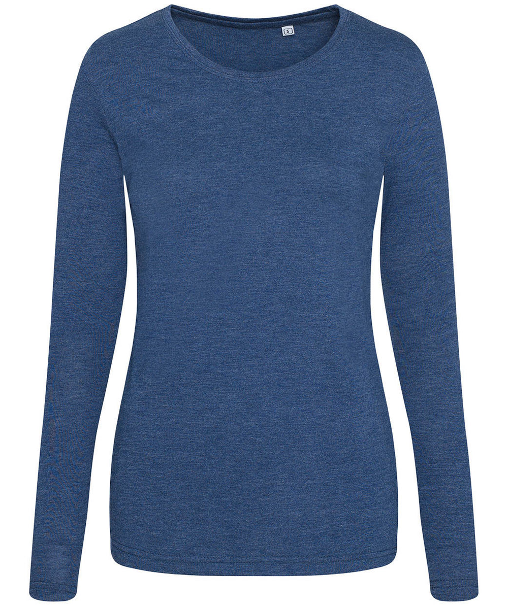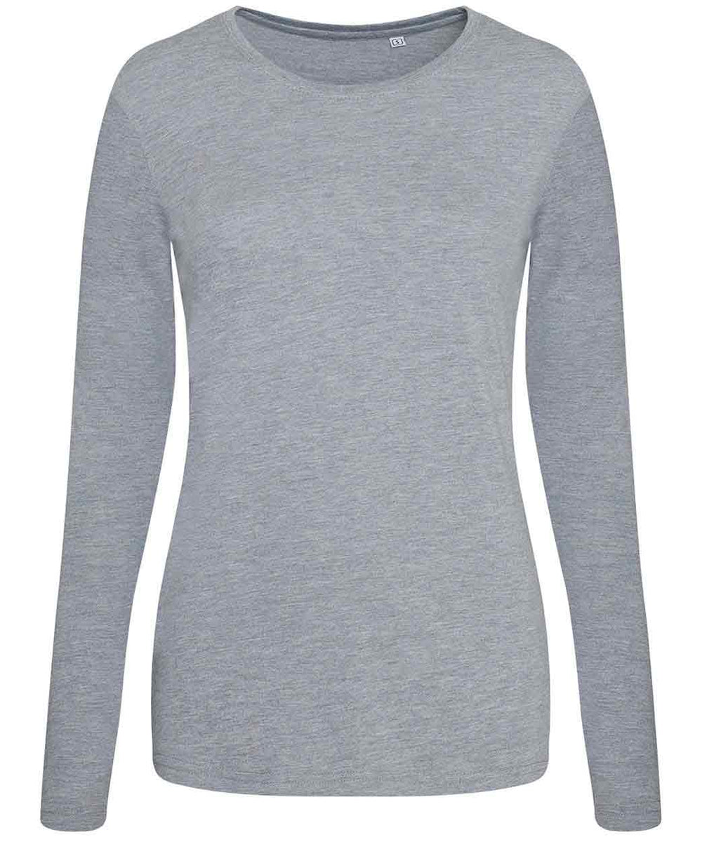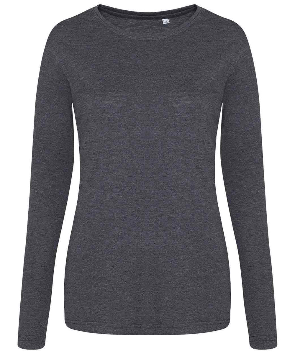 Girlie fit long sleeved T. Size tab label. Triblend fabric for style and comfort. Taped neck. Twin-needle stitching on sleeves and bottom hem. Ribbed crew neck style. soft-feel fabric. Side seams. Set-in sleeves. Worldwide Responsible Accredited Production (WRAP) certified production.