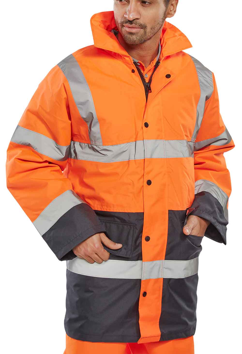 The B-Seen TJSTTENG Two Tone Traffic Jacket meets EN471 Class 3. Heavyweight PU coated polyester. Quilted lining with polyester filling. Two-way heavy duty zip front with storm flap. 2 Lower pockets with flaps. Inside breast pocket. Knitted storm cuffs. Concealed hood. Fully taped seams. Reflective Material.