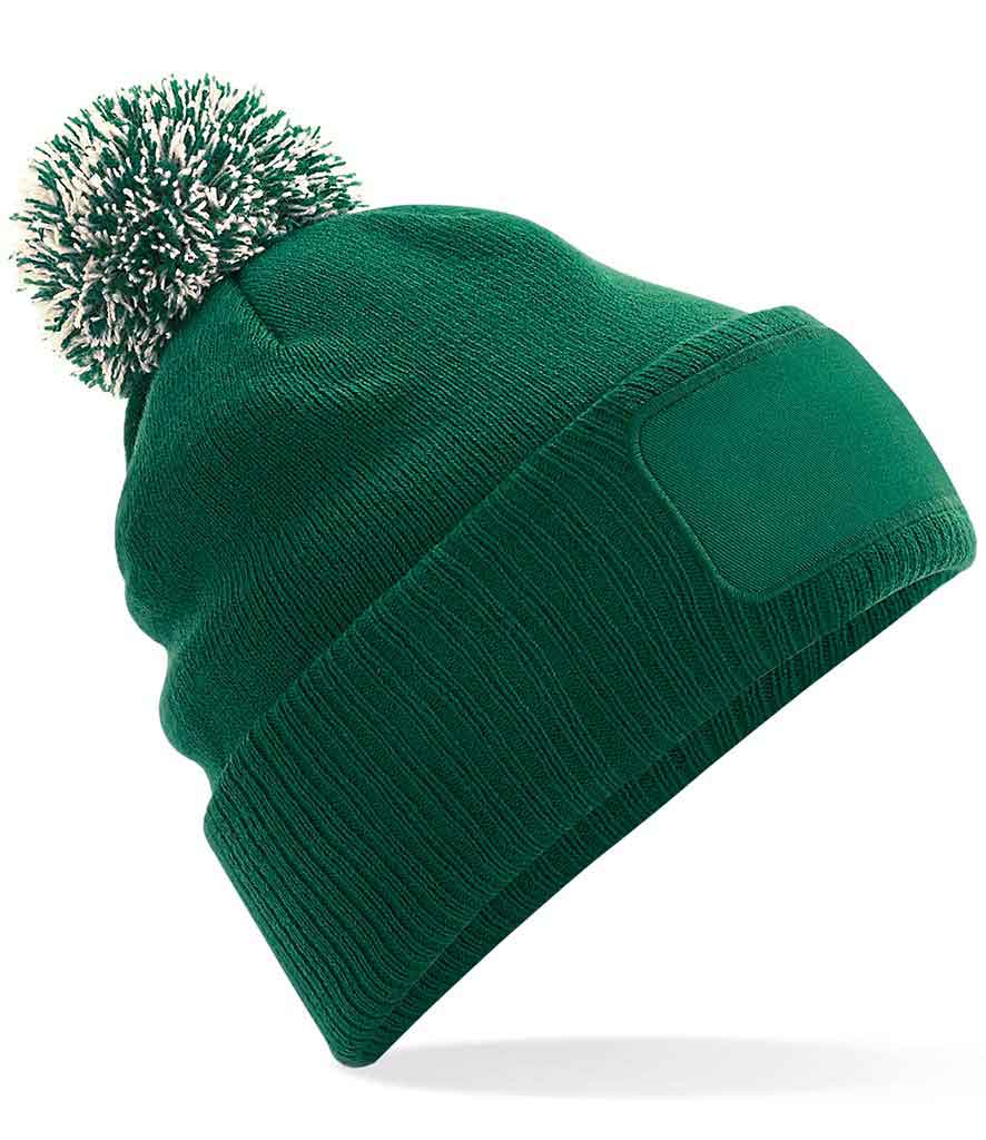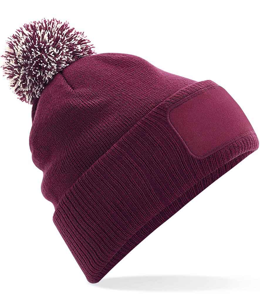 Tear-out label for ease of rebranding. Two-tone pom pom. Double-layer knit. Ribbed cuff. Cotton twill patch for printing. Reach certified.