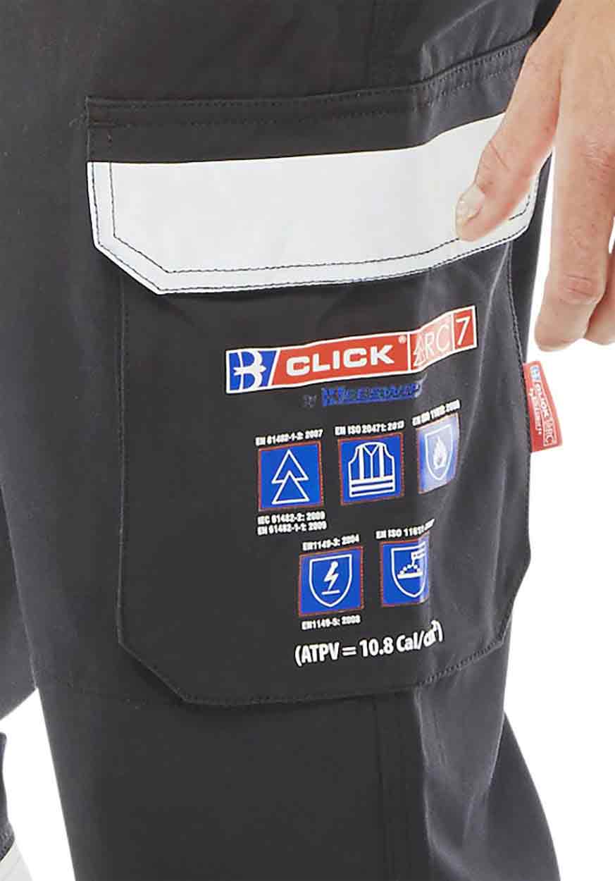 The Click ARC CARC7 features: FR, Hi Vis, Anti-static, ARC two tone Coverall. 300gsm 60/40 Modacrylic/cotton blend. Triple stitch construction. 2 hip pockets. Large bellows pocket to each leg with Velcro closure flap. Right leg mobile phone pocket with Velcro closure flap. All pocket flaps with Retro-reflective tape feature. Internal knee pad pouches. Large qualifying icons on left leg pocket. EN ISO 13688:2013 - General requirements for protective clothing. EN ISO 20471:2013 Class 3 - Test method for high visibility. EN 1149-3:2004 - Anti Static - Test methods for measurements of charge decay. EN 1149-5:2008 - Anti Static - Material performance and design requirements. EN ISO 11611:2015 (Class 1 A1 A2) - Protective clothing for use in welding. EN ISO 11612:2015 (A1 A2 B1 C1) - Protection against heat and flame. ARC IEC 61482-2:2009 - Performance requirements and design requirements. EN 61482-1-2:2007 (Class 1 = 4kA) - Box Arc testing EN 61482-1-1:2009 (ATPV = 10.8 Cal/cm2) - Open Arc testing.