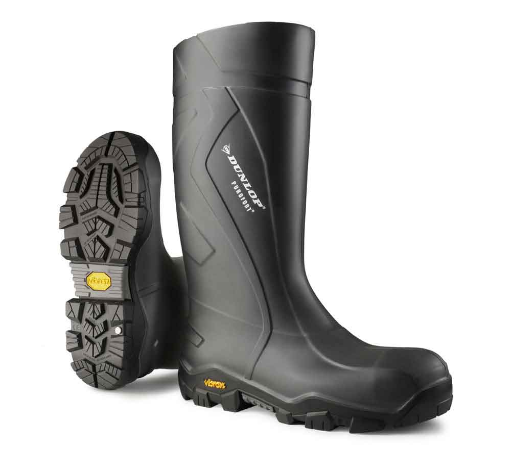 Best performance in oil slip, high every day comfort. The Dunlop Purofort+ Expander full safety offers the ultimate protection for workers in the upstream oil sector or general industry. Fitted with a special Vibram XS Work outsole, the wellington boot gives best in class scores for oil slip., The large outside lugs and torsion control ladder grip guarantee stability and safety under the most challenging conditions., The boot is extremely lightweight, gives a comfortable fit and does not crack or dry out, EN ISO 20345:2011 S5 CI HRO CR SRC, Resistance to: minerals, animal and plant oils and fats, fertiliser, acids, disinfectants, solvents, various chemicals