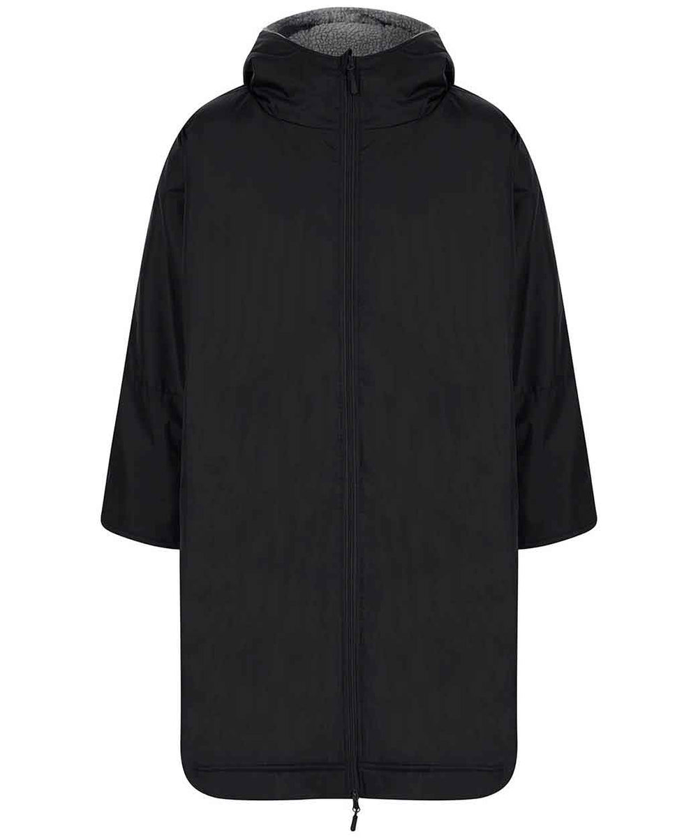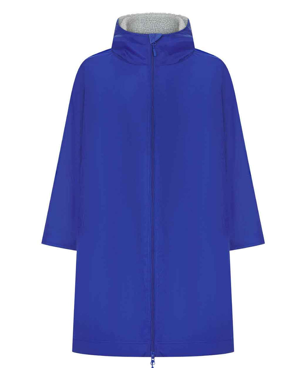 The ultimate team robe is made in a water-resistant fabric with a cosy sherpa fleece lining and three-piece hood. One size fits all, the roomy fit with double-ended full front zip allows wearers to keep warm and get changed underneath the robe. Perfect for wild swimming or wearing on team sidelines. Zipped pockets with fleece lining keep hands warm with multiple inner pockets for keeping belongings safe. Topped off with a large embroidery zip for access to directly decorate.
