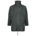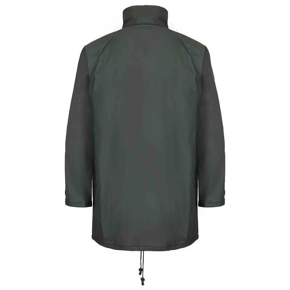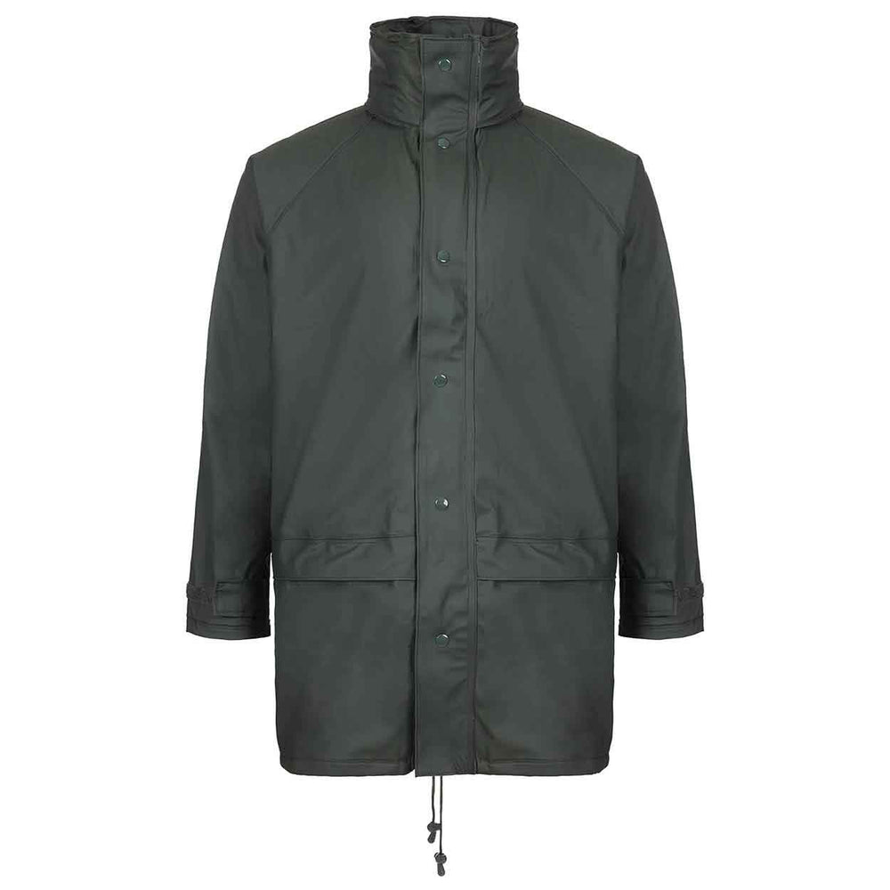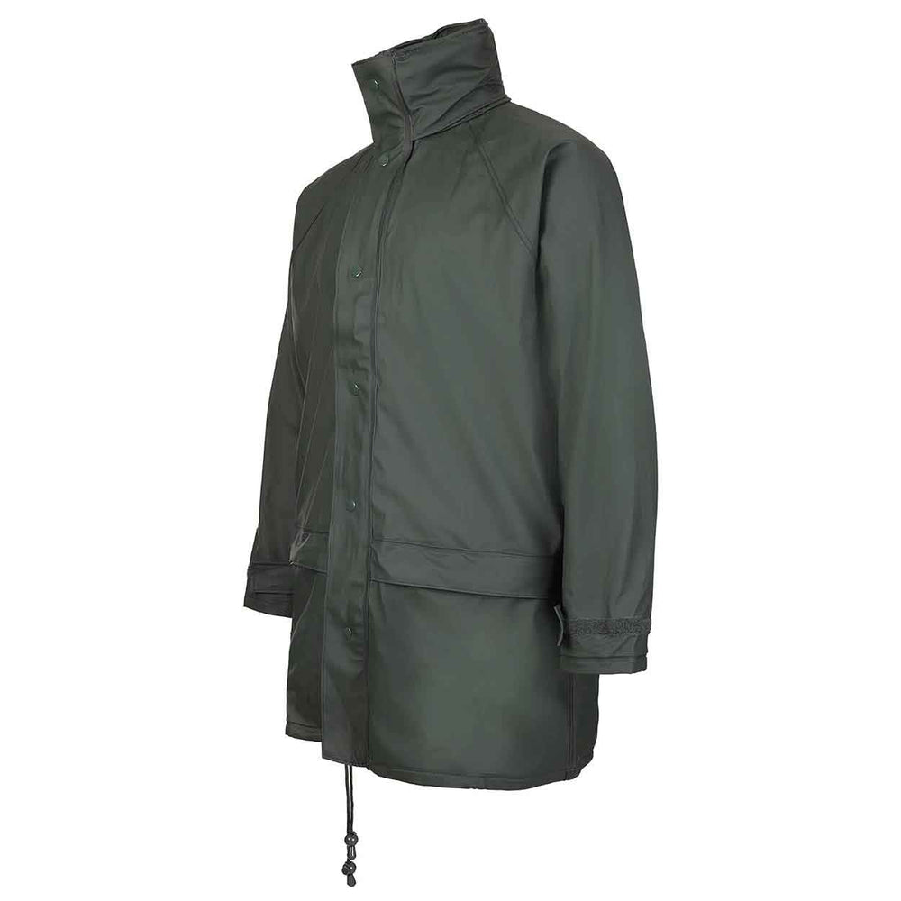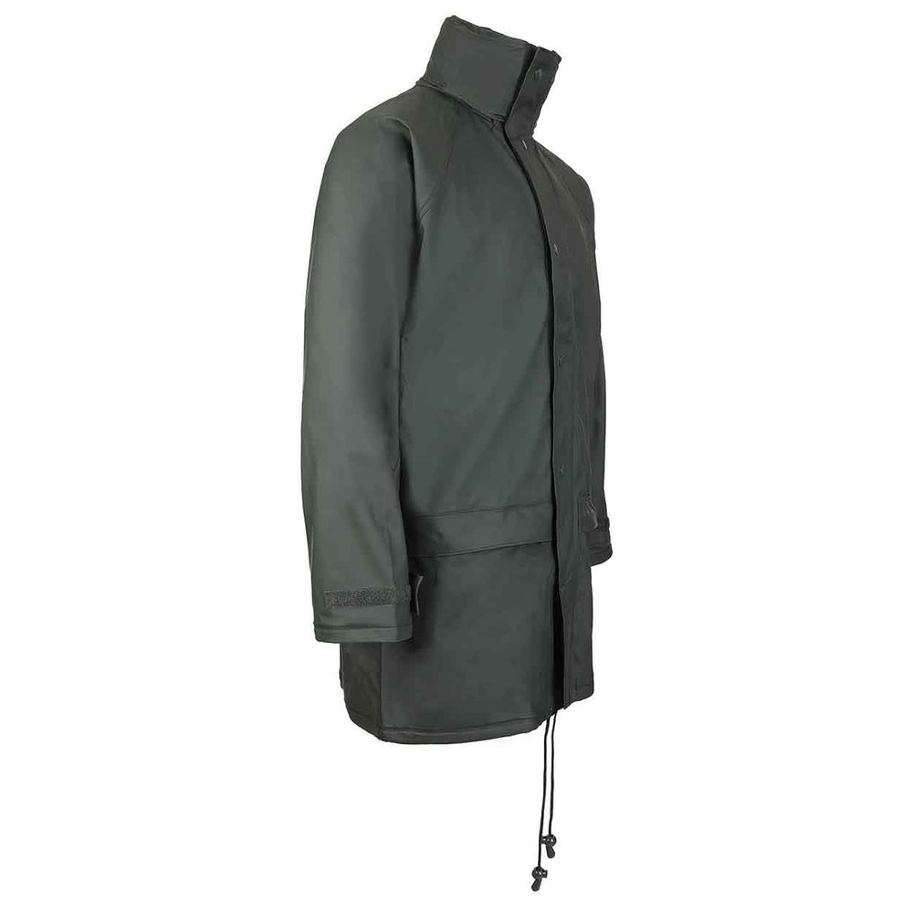 The Fort Workwear Flex Jacket features: waterproof stretchable PU tricot fabric, zip front with studded storm flap, concealed hood, large pockets with Velcro, adjustable cuffs with Velcro, welded seams, fabric: Pu Tricot Fabric.