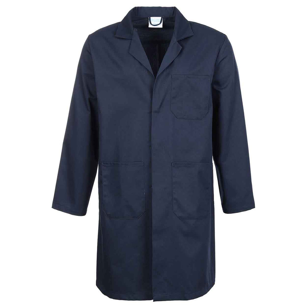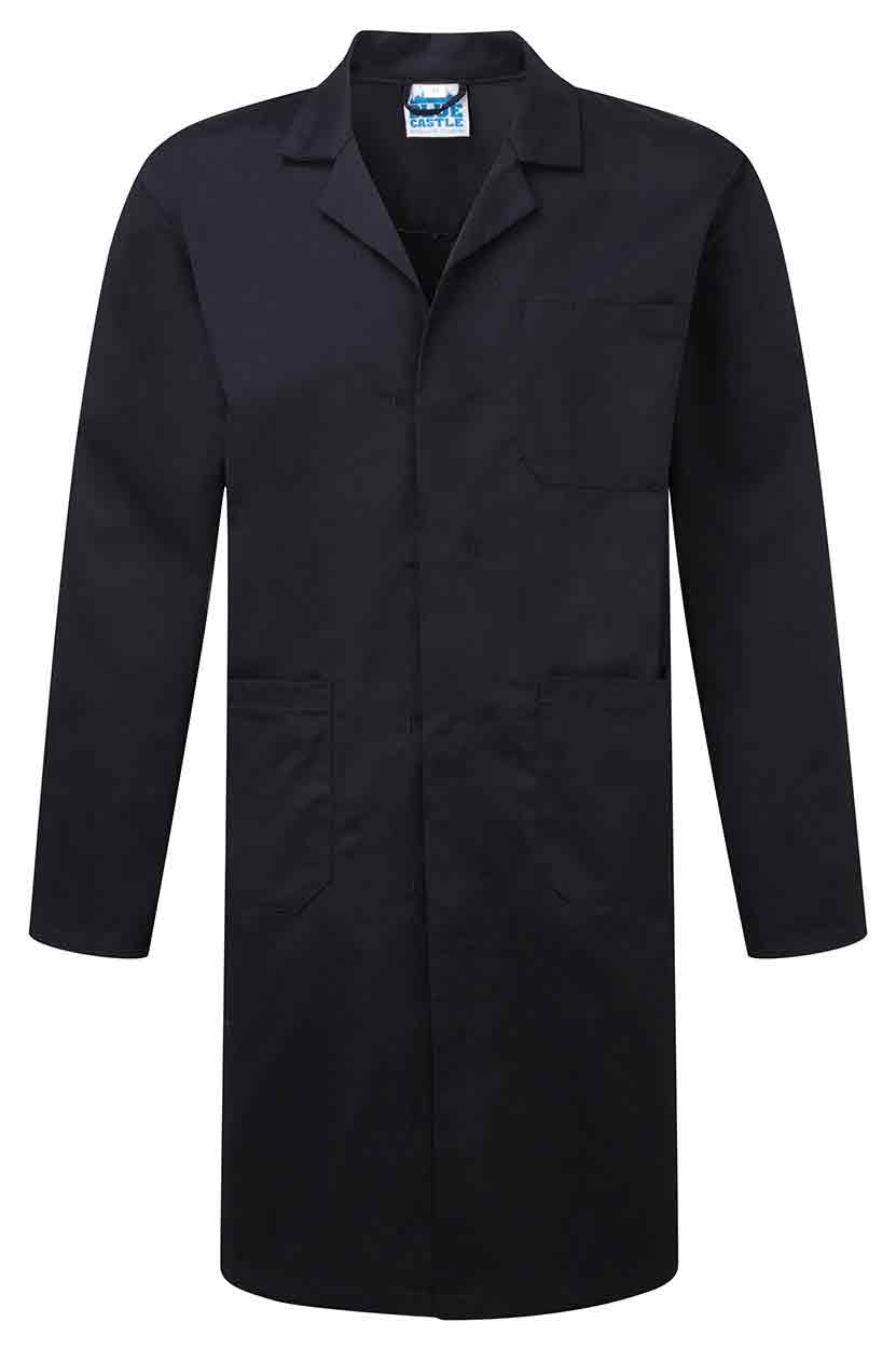 240gsm Polyester/cotton. Concealed press stud front. 1 breast pocket and 2 lower pockets. Rear vents. Side access slits.