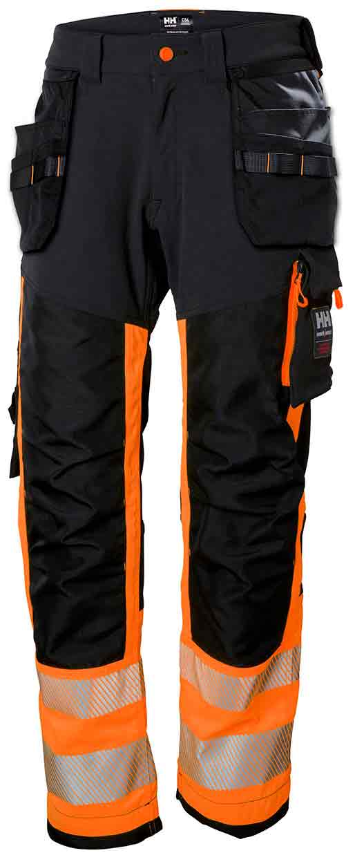 Finally! Hi-Viz just got comfortable. The durable 4-way stretch fabric combined with proven Helly Hansen Hi-Viz polyester/cotton combines flexibility, style, and safety. Modern fit, removable tool pockets and Cordura reinforced knee pockets - All in one! The unbeatable ease of movement to the limits.