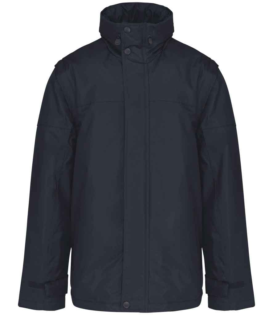 Kariban Factory Zip Off Sleeve Jacket. Polyester lining and padding. Concealed hood. Drawcord in collar. Full front zip with stud fastened storm flap. Zip off sleeves. Two front pockets. Inside pocket, zip pocket and phone pocket. Adjustable cuffs. Drawcord hem. Zip access for decoration. PVC coated polyester outer.