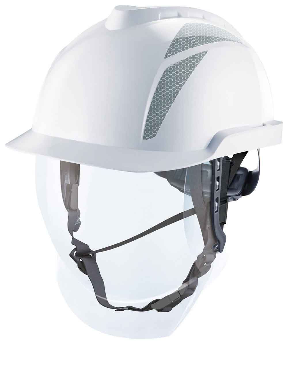 Balanced lightweight electricianGÇÖs safety helmet, non-vented, with 6-point Fas-Trac-« III ratchet suspension and GS-ET-29 class 1 face shield certified for protection against arc flash. For use where top impact hazards to the head, chemical splash, Ultra-Violet radiation, molten metal splash or electric arc to the face exist.• The helmet is made of ABS for strength and lateral crush protection (LD option)• Modern, dynamic with sports styled shell• Low profile (patented visor mechanism which minimises helmet shell size)• Channel around perimeter of the helmet diverts rain and debris from user• The face shield has premium anti-fog/anti-scratch coated visor fits over all corrective and safety glasses• 6-point Fas-Trac-« III ratchet suspension with premium washable and replaceable sweatband• Complete with 4-point chinstrap for better helmet retention• Helmet delivered in a protective reusable storage bag• Compatible with hearing protection• Optional chin cup made with arc flash resistant materials, Arc flash ear flaps, badge & Lamp holders, logo customisation and stickers available upon request• Other colour helmet shells available - Yellow, Red, Green, Blue and Orange Conforms to the following Standards• Anti-static assembly; certified electrostatic-INERIS for use in ATEX/explosive environments• Electrically insulating helmet meeting EN 397:2012 Industrial safety helmets 440 V AC and EN 50365 Insulating helmets for use on low voltage installations 1000 V AC• EN166:2001 personal eye equipment 2C-1,2 1 3 B 8-1-0 9 KN• GS-ET 29 Electric Arc, class 1, 4KAMSA Reference: GVF1A-80A0000-000