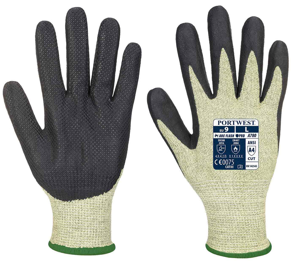 Created with flame resistant properties, the Arc Grip Glove provides a high level of protection against Arc Flash burns and cuts. The 13-gauge cut level D knitted liner is manufactured with a unique flame-resistant aramid yarn which provides increased dexterity and hand movement. The flame-resistant neoprene coated palm allows for excellent grip. Arc Flash level 2 (ATPV 9.5cal/cm2).