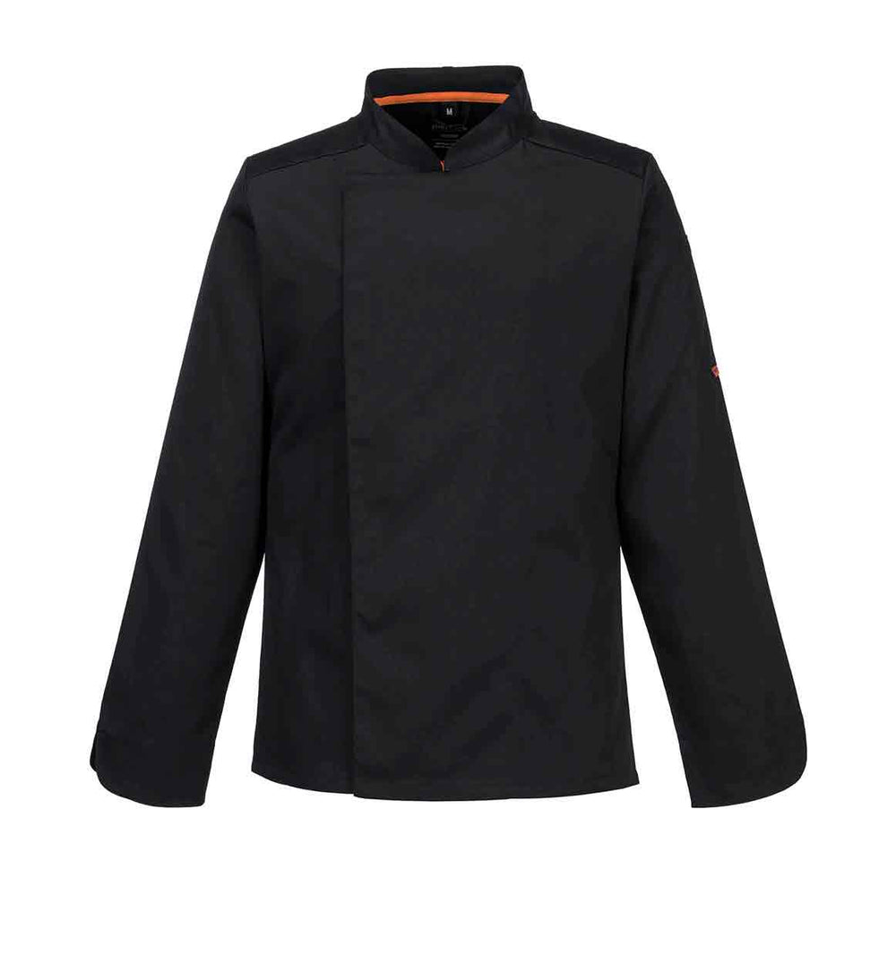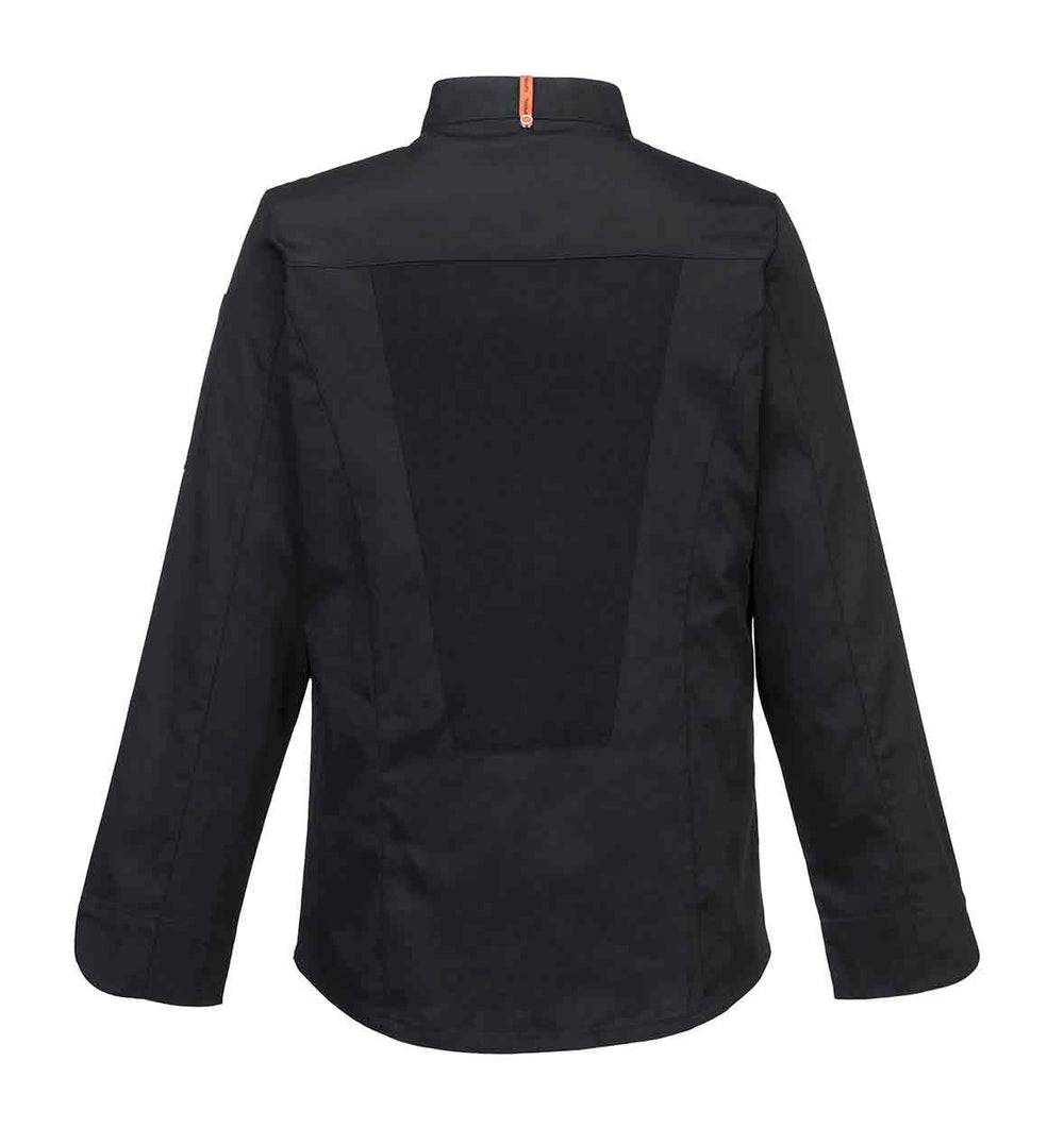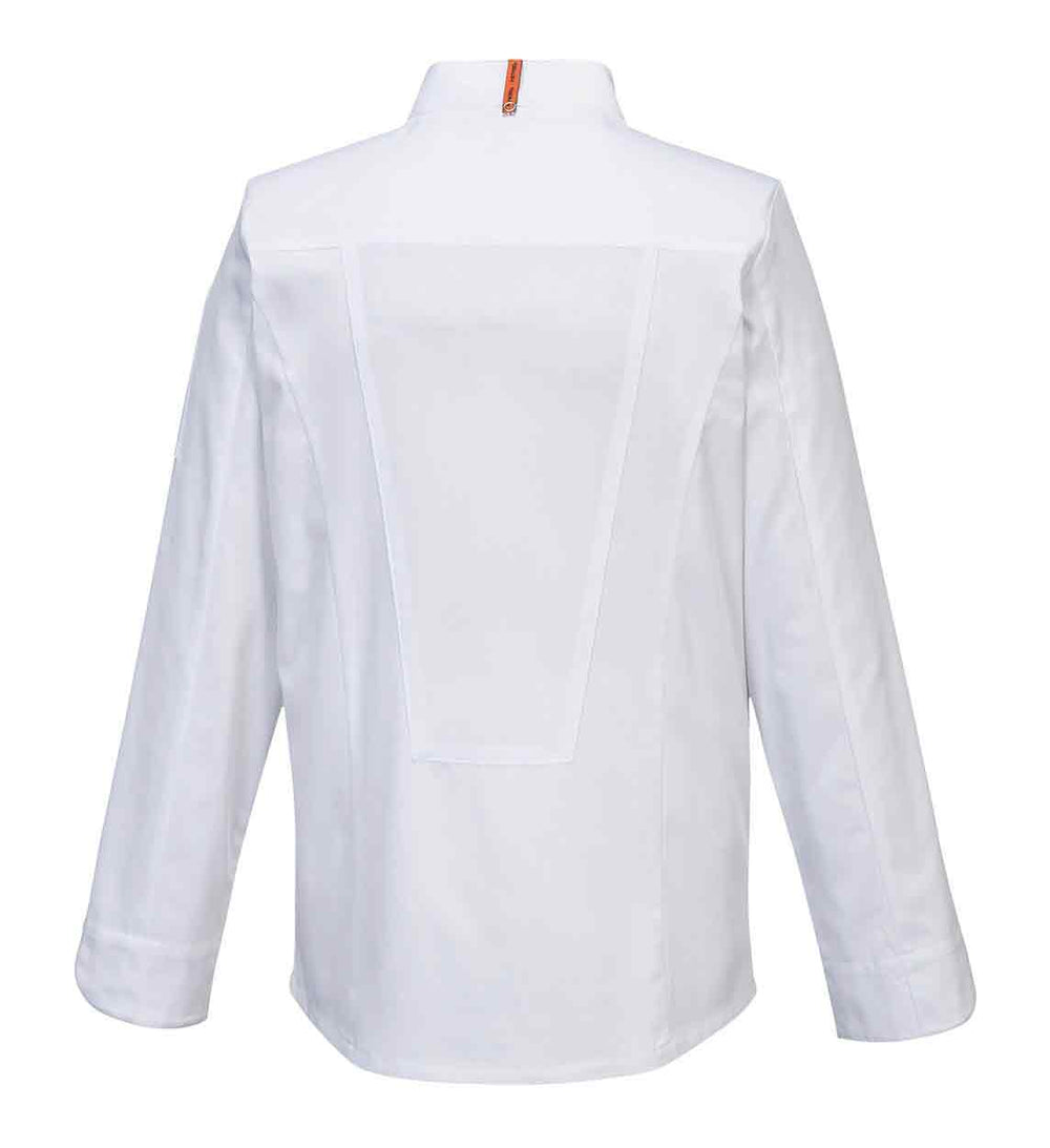 This chefs jacket uses a lightweight fabric and offers a modern, slimmer silhouette with an ergonomic fit. Features of this jacket include double breasted concealed stud front fastening, apron tab at the back of the neck and large MeshAir Pro panels at the back and underarms for outstanding breathability.