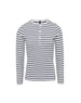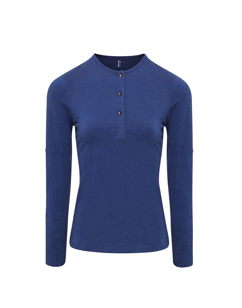 Long sleeve tee that has roll sleeve capabilities with button tab on the inside of the sleeve to secure in place. Round neck style with a three button placket. Twin-needle stitching to the hem and cuff.