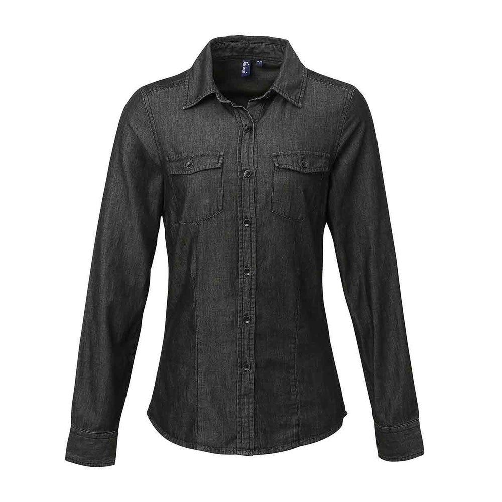 The Premier PR322 Women's jeans stitch denim shirt features: Long sleeve denim shirt with contrast stitch detail with two chest pockets. Buttoned cuff and sleeve guard. Curved hem. Back yoke. Washing Instructions. Domestic wash 40 Deg c. Contrast stitching 2 chest pockets Curved hemFabric100% Cotton, ringspun denimWeight127gsm. XS - 3XL. XS 8 S 10 M 12 L 14 XL 16 2XL 18 3XL 20