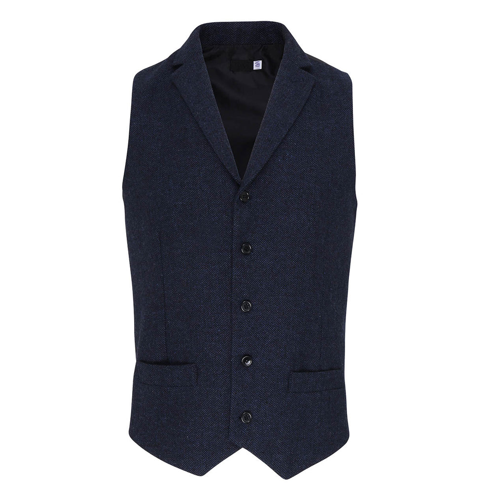 An attractive, versatile waistcoat for men. Styled with a lapel collar that leads into the main body of the waistcoat with five button fastening. The herringbone pattern has been achieved by two coloured yarns being woven together. This waistcoat is fully lined on the underside and to the reverse where there is a buckle for the wearer to adjust accordingly. Features two front open pockets.