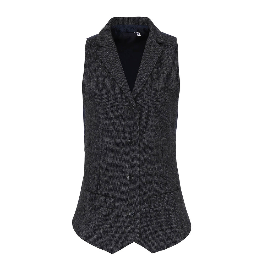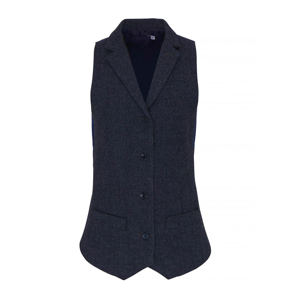 An attractive, versatile waistcoat for ladies. Styled with a lapel collar that leads into the main body of the waistcoat with four button fastening. The herringbone pattern has been achieved by two coloured yarns being woven together. This waistcoat is fully lined on the underside and to the reverse where there is a buckle for the wearer to adjust accordingly. Features two front open pockets.