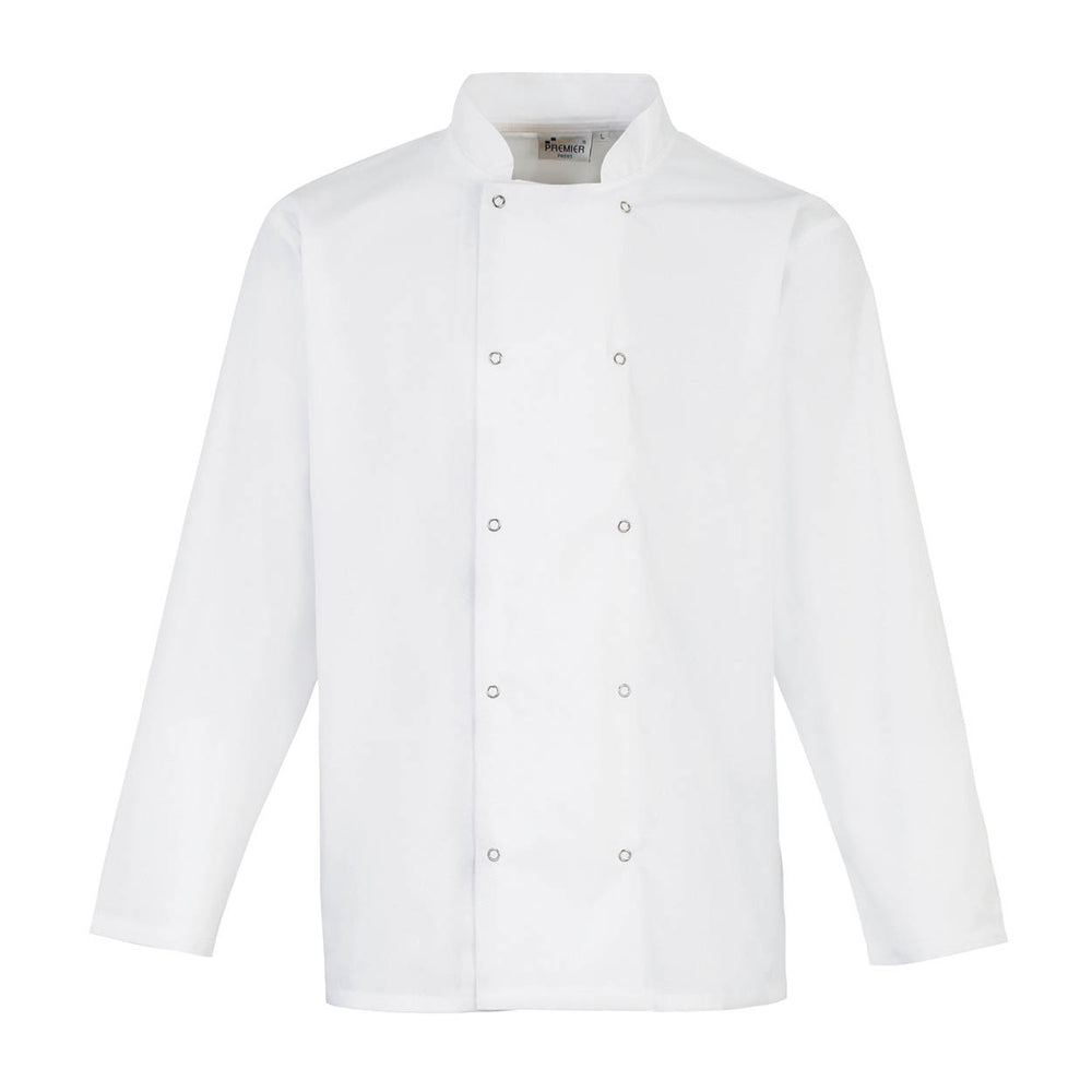 The Premier PR665 Studded front long sleeve chef's jacket features: Made from OEKO-TEX Standard 100 fabric and specially engineered for user comfort in the kitchen environment, this long sleeved chefs jacket has easy fastening press studs for quick and convenient dressing. Washing Instructions Industrial laundering at 85 Deg . 10 press stud fastening. Unisex styling. Mandarin collar Fabric 65% Polyester, 35% Cotton Weight 195gsm. XS - 2XL. XS 33" S 37" M 40" L 42" XL 46" 2XL 49"