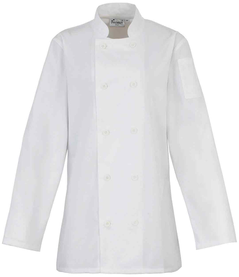 The Premier PR671 Women's long sleeve chef's jacket features: Women's fitted chefs jacket. Long sleeved. 10 button hole wrap-over fastening. Panelled back for more fitted style. Left sleeve pen pocket. Mandarin collar. Made from OEKO-TEX Standard 100. Washing Instructions Industrial laundering at 85 Deg . Panelled back for a fitted shape. Left sleeve pen pocket10-buttonhole wrap-over fastening Fabric 65% Polyester, 35% Cotton Weight 195gsm. XS - 2XL. XS 8 S 10 M 12 L 14 XL 16 2XL 18