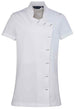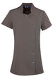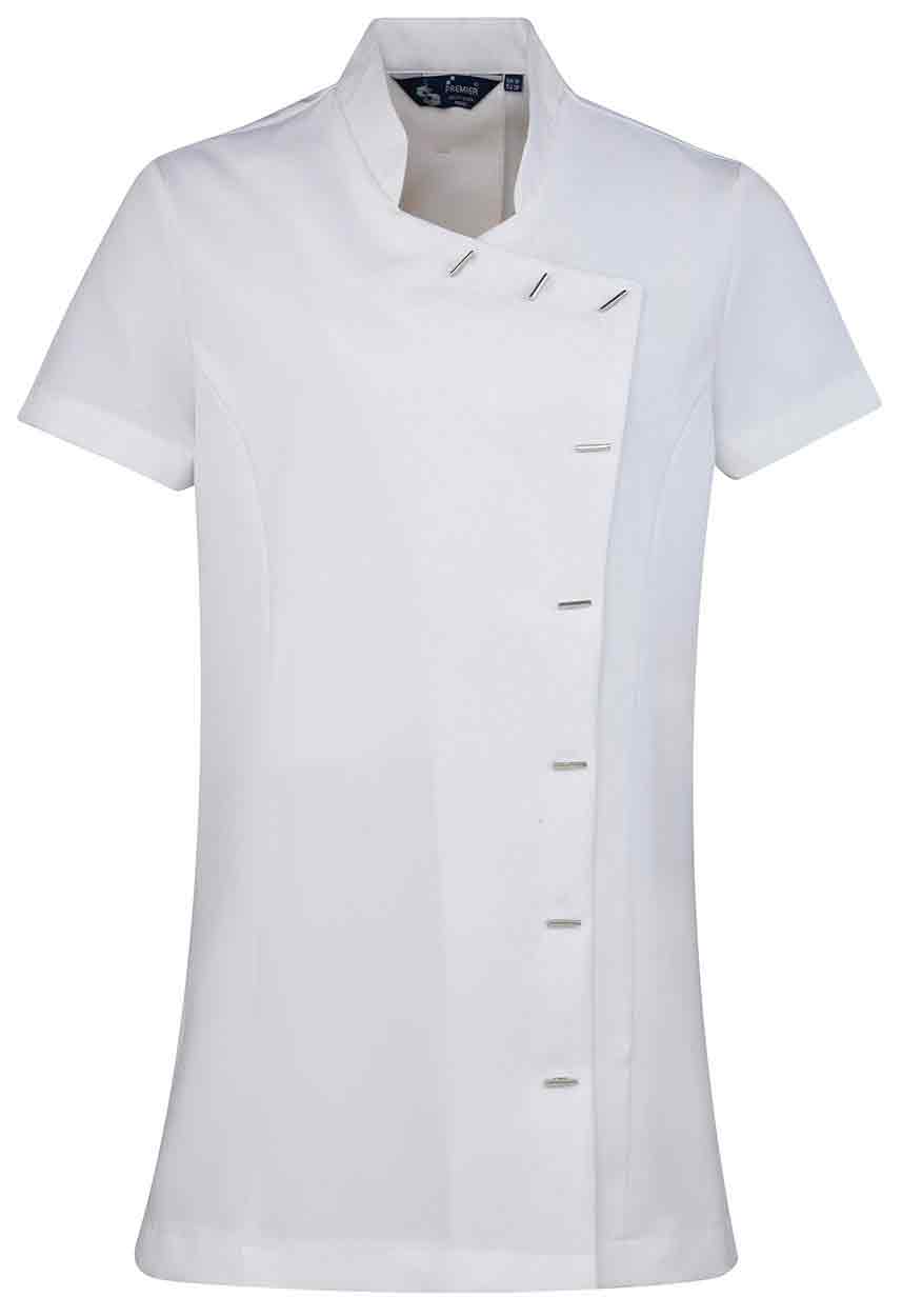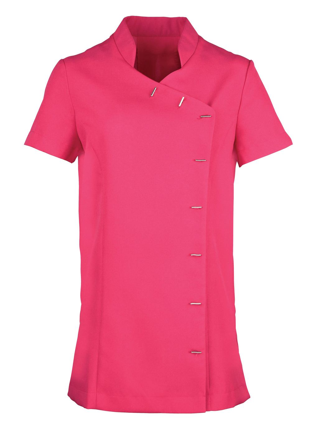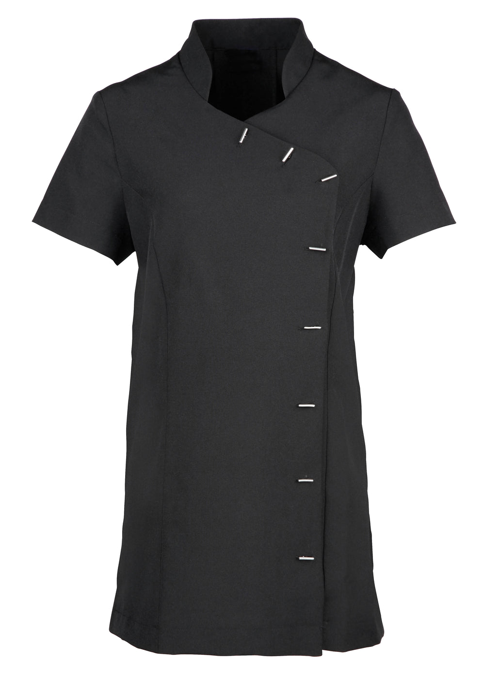 The PR682 is a beauty and spa tunic with mandarin collar. Asymmetric button fastening to the front with 8 bar shaped buttons. Short sleeve. Side vents. Back pleat for ease of movement. Princess seams. Easycare. Back pleat for ease of movement8 bar button front fastening. Flattering feminine fit Fabric:100% Polyester plain weave with inherent stretch capabilities, fabric weight: 185gsm.