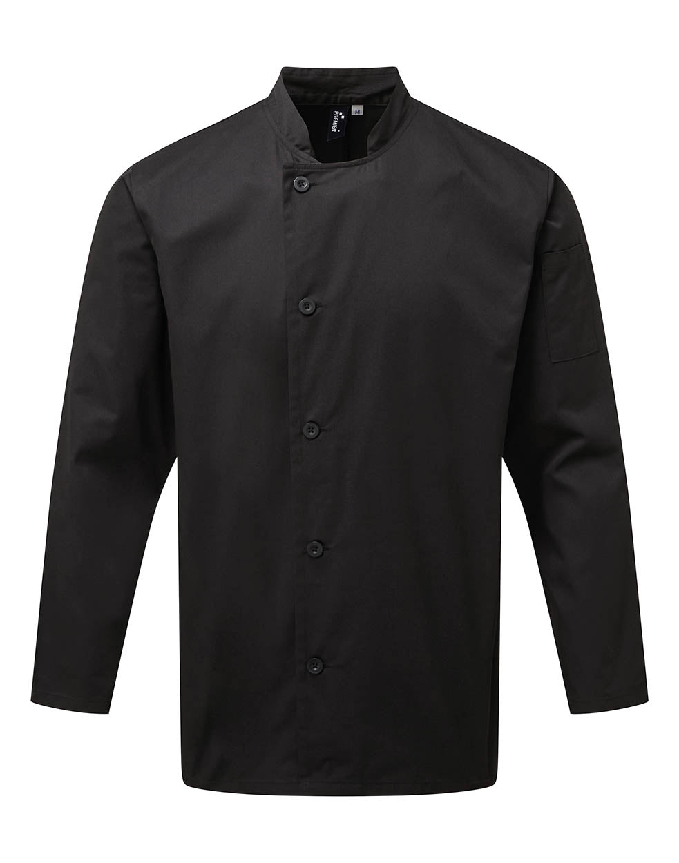 Right hand wrap fastening with five long life resin buttons. Left sleeve double pan pocket. Mandarin collar.