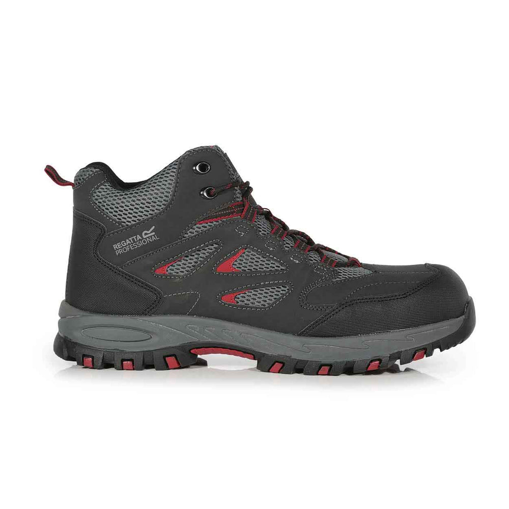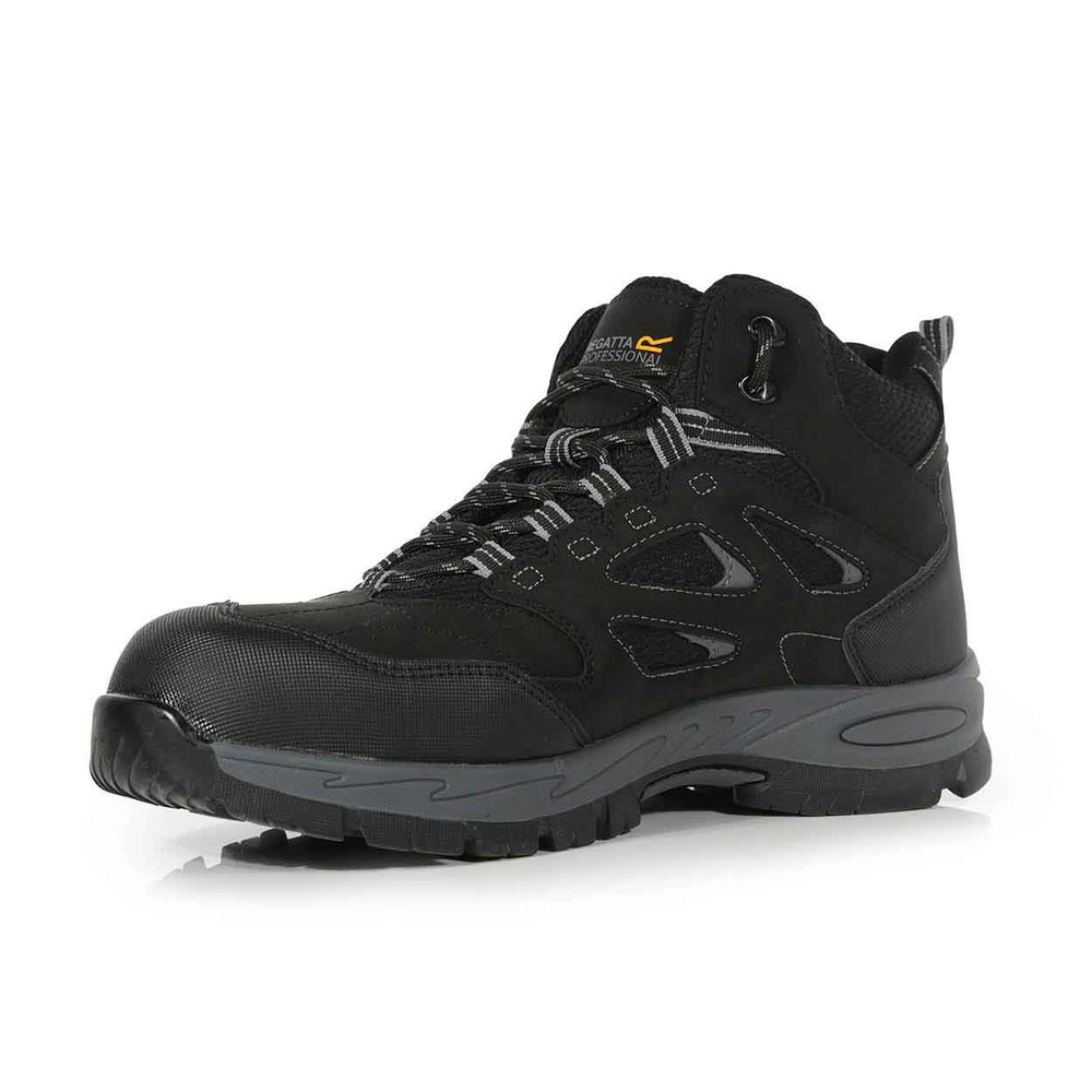 The Regatta Professional TRK201 Mudstone S1P Safety Boot features: • Conforms to EN20345: 2011 - S1P • Water resistant PU nubuck and mesh upper with padded ankle protection • Moulded EVA comfort footbed • Steel toe cap with oil resistant rubber outsole
