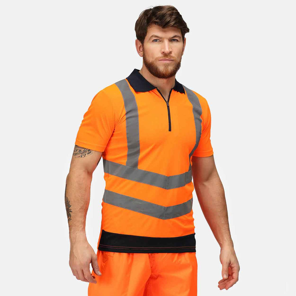 The Regatta Professional TRS189 HiVs Pro Polo features: • 100% quick dry polyester pique fabric • Conforms to EN20471: 2013 +A1: 2016 Class 2 (orange also RIS-3279-TOM) • Natural wicking fabric • Ribbed collar with zip neck