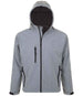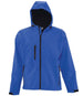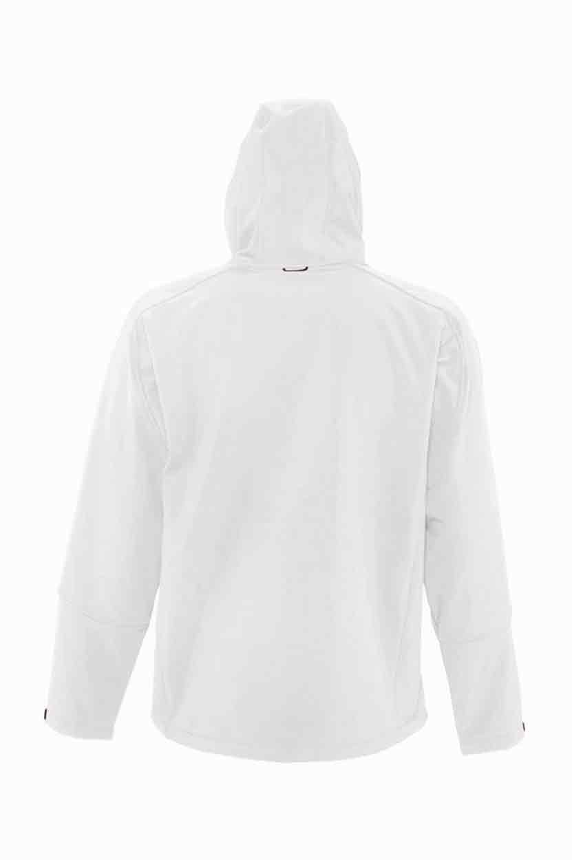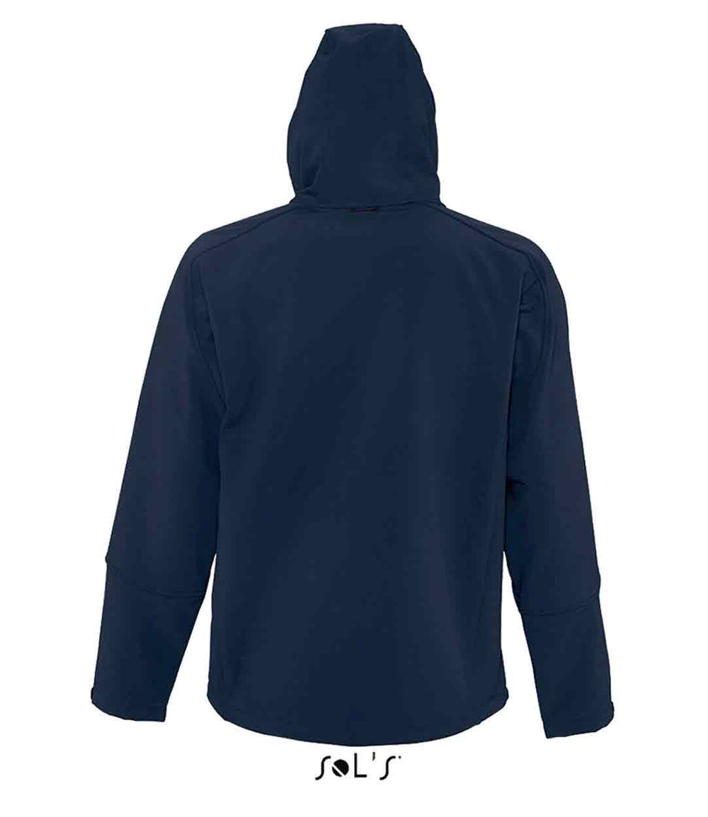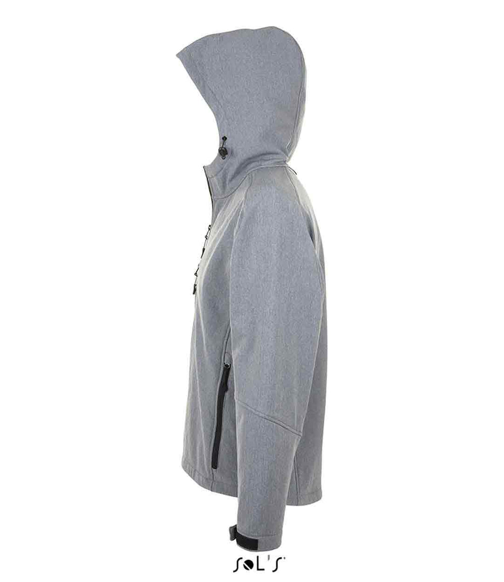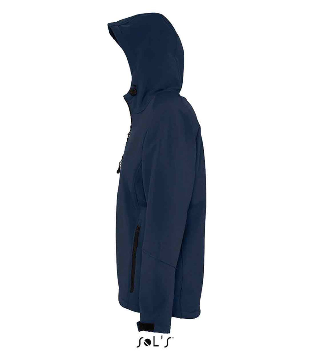 SOL'S Replay Hooded Soft Shell Jacket Material: Stretch soft shell fabric has a 94% polyester/6% elastane outer, membrane and polyester fleece backing. Breathable, windproof and water resistant. Taped neckline. Hood with adjustable drawcord. Collar high full zip with inner storm flap and chin guard. Two front zip pockets and one right chest zip pocket. Tear release adjustable cuffs. Adjustable drawcord hem. Drop tail. Access for decoration.